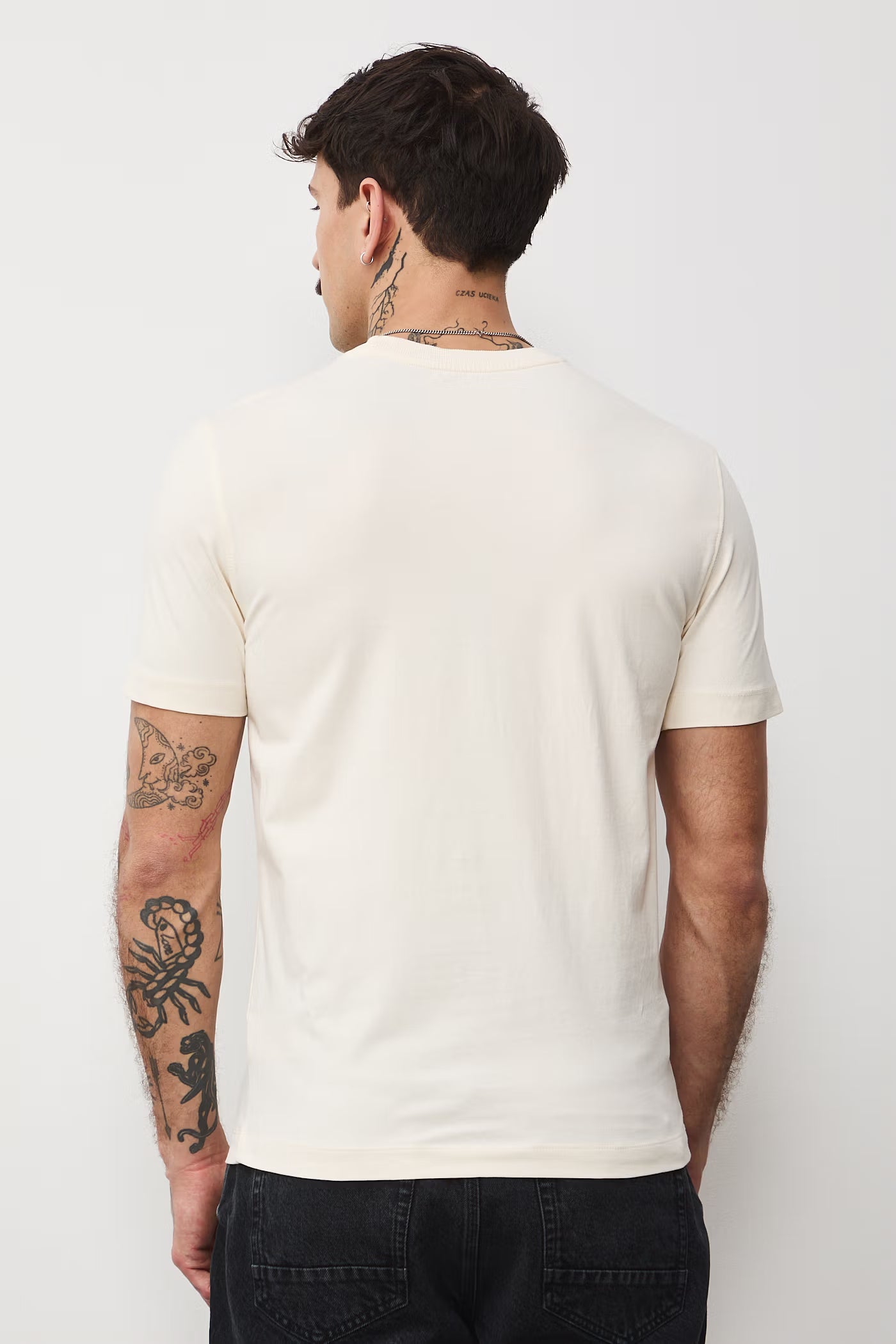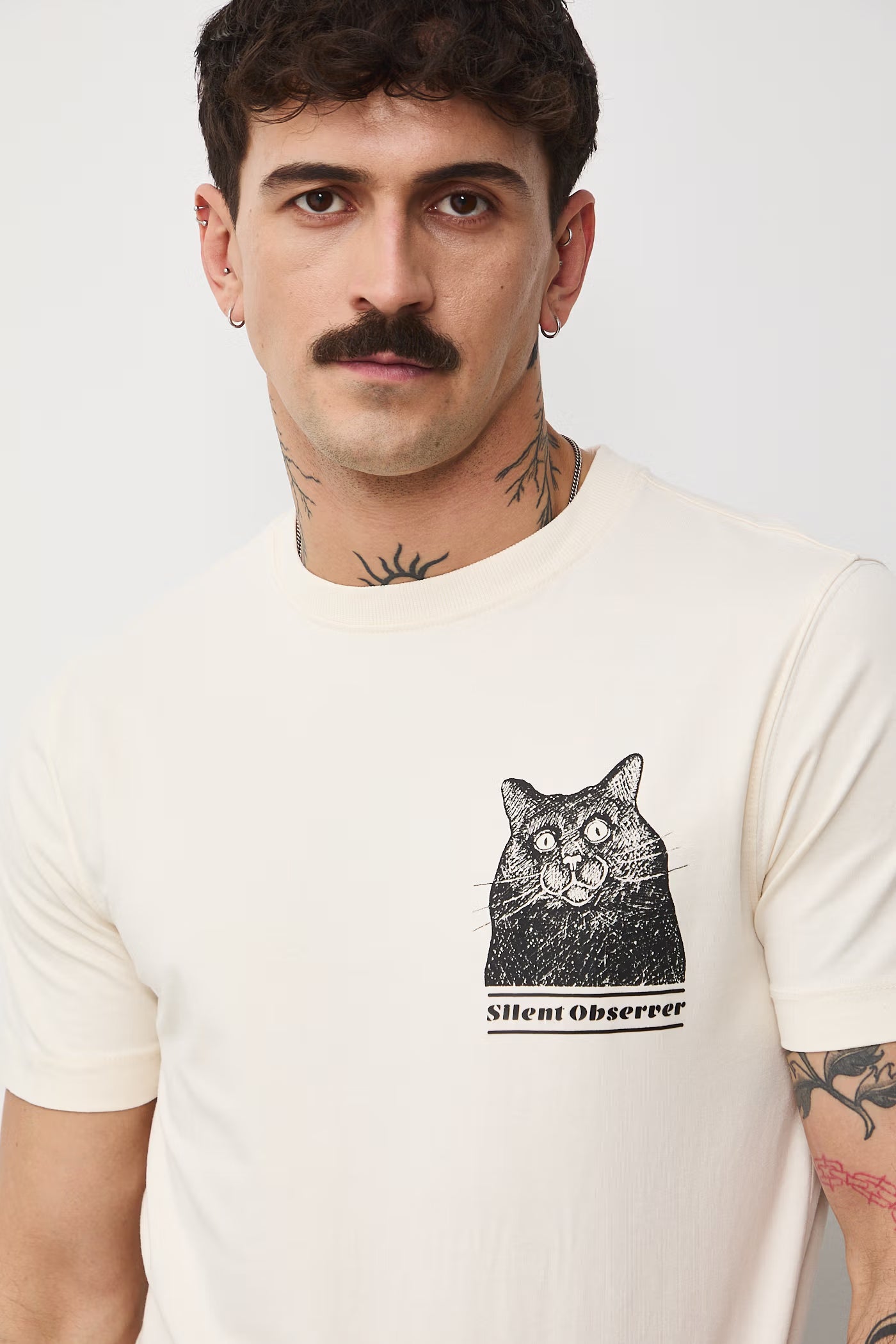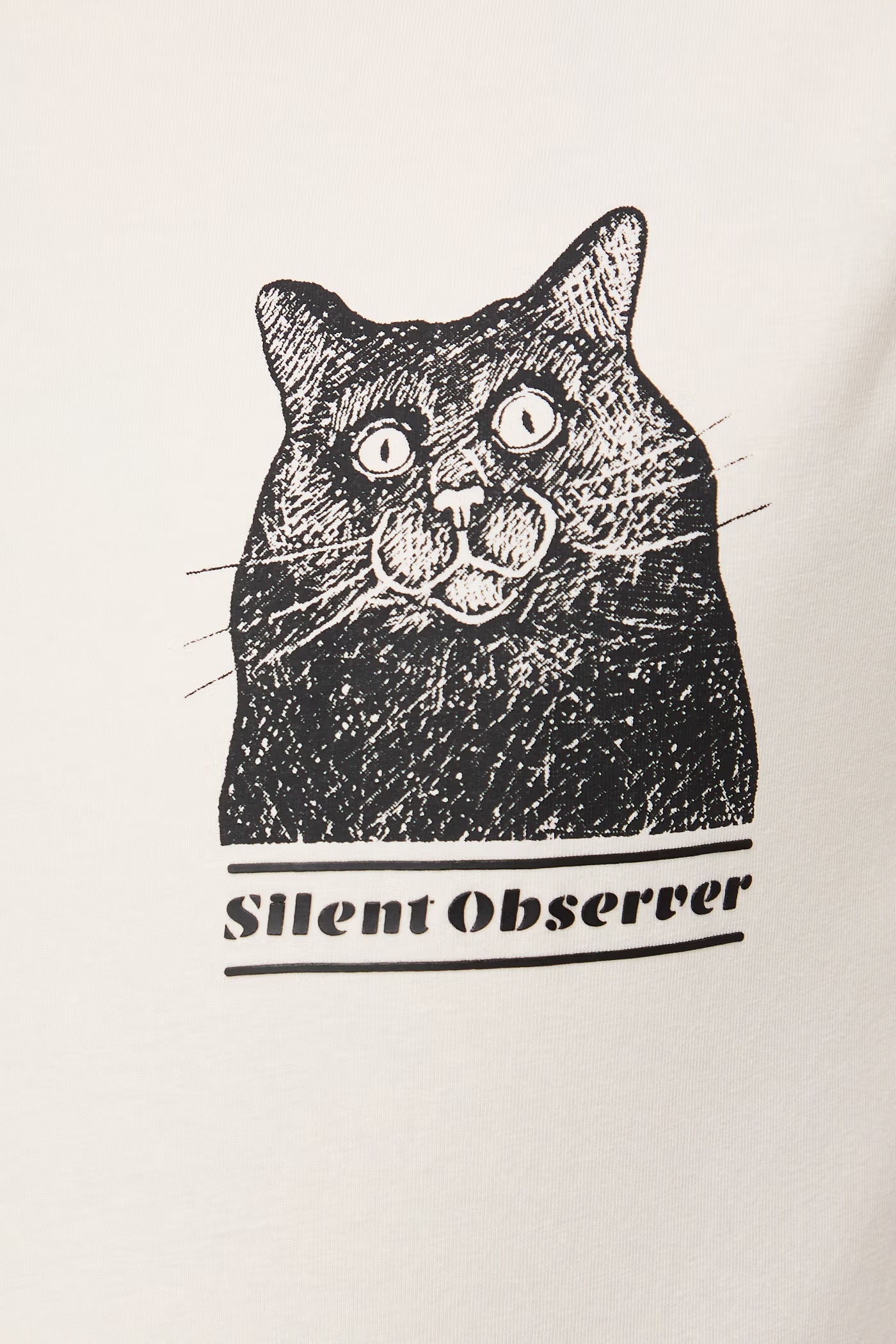 Дизайнът е слит фит (Slim Fit), което придава модерна и прилепнала към тялото линия, подходяща за градски и неформален стил. Малкият принт на гърдите съдържа абстрактно артистично изображение на котка, което добавя характер и индивидуалност към модела.